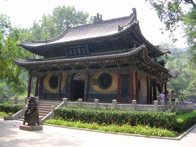 在中轴线末端,是宏伟壮丽的圣母殿。圣母殿背靠悬瓮山,前临鱼沼,晋水的其他二泉——“难老”和“善利”分列左右。此殿创建于北宋天圣年间(公元1023——1032年),崇宁元年(公元1102年)重修,是现在晋祠内最为古老的建筑。殿高约十九米,重檐歇山顶,面宽七间,进深六间,平面布置几乎成方形。殿身四周围廊,前廊进深两间,廊下宽敞。在我国古代建筑中,殿周围廊,此为现存最早的一个实例。殿周柱子略向内倾,四根角柱显著升高,使殿前檐曲线弧度很大。下翘的殿角与飞梁下折的两翼相互映衬,一起一伏,一张一弛,更显示出飞梁的巧妙和大殿的开阔。殿、桥、泉亭和鱼沼,相互陪村,浑然一体。圣母殿采用“减柱法”营造,殿内外共减十六根柱子,以廊柱和檐柱承托殿顶屋架,因此,殿前廊和殿内十分的宽敞。“减柱法”的熟练使用。说明宋代在建筑上已进一步掌握了力学原理;斗拱和柱高的比例适当,避免了隋唐建筑中用料的浪费,在建筑式样上也更富于艺术性。我国的木结构建筑,经历了一个由隋唐的雄壮坚实到明清的华丽轻巧的发展地程,而宋代建筑正是这个过程中的重要环节。圣母殿是宋代建筑的代表作,对于研究我国宋代建筑和我国建筑发展史都很有价值。殿内无柱,不但增加了高大神龛中圣母的威严,而且为设置塑像提供了很好的条件。殿内共四十三尊泥塑彩绘人像,除龛内二小像系后补外,其余多北宋代原塑。主像圣母,即唐叔虞和周成王的母亲,周武王的妻子,姜子牙的女儿——邑姜,其塑像设在大殿正中的神龛内。其余四十二尊侍从像对称地分列于龛外两侧。其中宦官像五尊,著男服的女官像四尊,侍女像共三十三尊。圣母邑姜,曲膝盘坐在饰凤头的木靠椅上,凤冠蟒袍,霞帔珠璎,面目端庄,显示了统治者的尊贵和奢华。四十二个侍从像,手中各有所奉,为帝后服种种劳役,例如侍奉文印翰墨,洒扫梳妆,奉饮食,侍起居以至奏乐歌舞等等。这些塑像造型生动,姿态自然,尤其是侍女像更是精品。宋代的艺人,满怀同情,塑造了一群终生被幽禁深宫,失去了自由,埋葬了青春的女性。这些侍女像的肢体身材比较造度,服饰美观大方,衣纹明快流畅。她们的年龄或任或少,身段或丰满或苗条,面庞或圆润或清秀,神态或幽怨或天真,一个个性格鲜明,表情自然,加之高度与真人相仿,更显得栩栩如生。这组塑像突破了神庙建筑中以塑造神佛为主的老套,真实地表现了被禁锢深宫受尽役使的侍从们的生活精神面貌,从而反映了封建社会中的一个侧面。在技巧上,显然相当准确地掌握了人体的比例和解剖关系,手法纯熟,有高度的艺术表现力。它们是我国古代雕塑艺术中的珍品,在美术史上占有重要的位位。人们谈到晋祠,往往总要谈到这些精彩的宋塑。