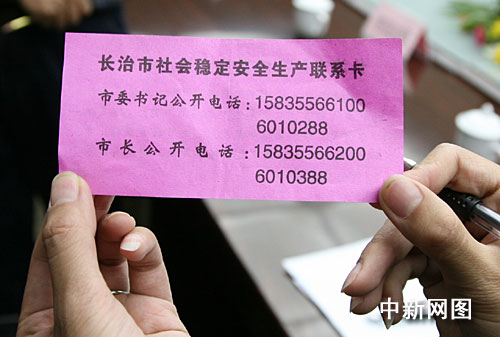 中新网长治10月21日电(记者 唐伟杰 任丽娜)9月底,山西长治市共印制了96万张印有市委书记和市长电话的“名片”。这些“名片”日前陆续发放到全市1万名公安干警、5万名煤矿工人、10万市民家庭、80万农民家庭。长治市民可直接拨打“名片”上的电话反映问题。
