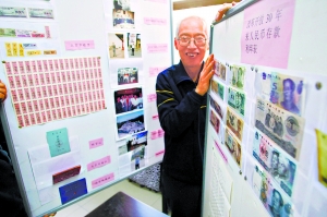 从2元的1995年版公交月票,到30元的2004年版公交月票,粮票、油票、工资条、彩票、选民证等,柯富海老人的100多件收藏品,在西花市大街南里居委会林林总总摆满了三面墙。这是一位花甲老人的“个人改革开放30周年展”。