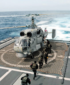“平时训练多流汗,上了战场才会少流血。”这是谢增岭和特战队员的人生信条。昨天,当不少舰员还处于晕船状态时,特战队员们就开始了高强度的训练:首次在大洋上乘坐直升机滑降舰艇!这对普通士兵绝对是一个高难科目,可对特战队员们而言,却显得轻松从容。特战队员分批登上轰鸣的舰载直升机,利用一根细绳滑降着舰。身着一身黑色特战服的战士们从天而落,优美的空中姿态犹如一只只掠水而过的飞燕,轻盈地落在了后甲板上;随即,相互掩护着迅速展开战斗行动……