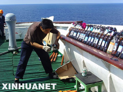 新华军事特派记者朱鸿亮在"武汉"号驱逐舰上发回最新的连线报道。