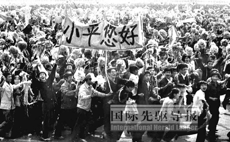 不远处,坐在木头临时搭建的台子上,3000名日本青年也看得目瞪口呆,他们和中国观众一起欢呼着,跳跃着,没有人愿意离开位置半步,生怕错过任何一个历史镜头。突然,在群众方队中,几名北大生物系学生拉出了一条由床单做成的横幅,绿色大纸上写着:“小平您好!”四个大字。这是一个未经审定的标语,几名便衣准备上前抢夺,但还没来得及行动,全场已经沸腾了起来。