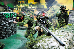 头顶上机群盘旋俯冲,身边枪声、爆炸声此起彼伏,一场激烈的对抗正在一个特殊的“战场”进行。1月8日上午,记者在济南军区某团真人CS对抗阵地看到:“战场”上矮墙林立、沙包堆积、枯树横亘……战士们身着作训服,手持仿真枪,头戴装有感应器的头盔,在时明时暗的“夜空”下穿梭,寻找目标,激烈对抗。据有关负责人介绍,实施真人CS对抗练兵在我军部队还是首家。(CS是Counter-strike的缩写,中文意为反恐精英。)