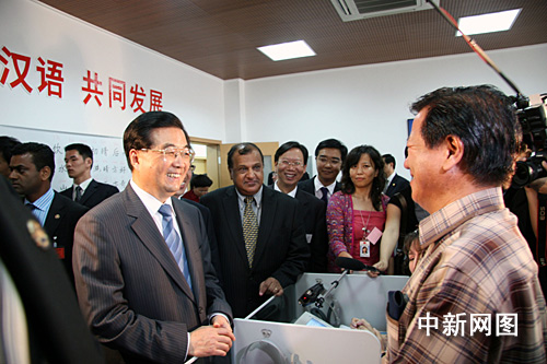 参观过程中,胡锦涛向三位不远万里来到这里执教的中国老师张鑫、魏爱玲、郭卫红表示感谢。