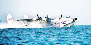 这是一架外形奇特的飞机:机翼两侧各垂有一个巨大的橄榄球状物,机腹是倾斜的切割面形状,好似巨轮的船身。看到记者一脸疑惑,值班领导、政委张汝翼为记者指点迷津:“这就是我们部队号称‘海天鲲鹏’的水上飞机,是全军仅有的一种特殊机种,不仅能航行在辽阔的江河湖海,还能驰骋在蓝天之上,机翼两侧配有保持浮力和平衡的‘浮筒’……”