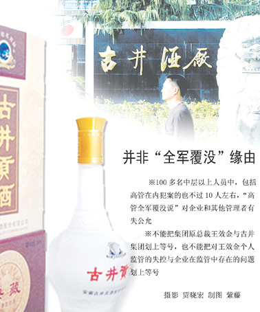 “不论在时空上还是判断上,都不能这么随意地将‘全军覆没’与古井集团高管划上等号。”曹杰告诉记者,在王效金(古井集团原总裁)窝案中,古井集团的7名高管只有3人涉案,100多名中层以上人员中,包括高管在内犯案的也不过10人左右,“高管全军覆没说”对企业和其他管理者有失公允。