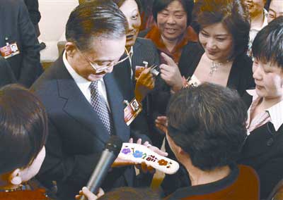 王金初向温总理激动地说,“总理,我是来自农村基层支部书记代表,有个80多岁的老人,要我送一双鞋垫给你,她说她过上了好日子,要感谢总理。(鞋垫绣上)这个福就代表我们老百姓有这样的总理,有福气!”