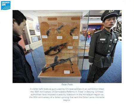在北京举办的西藏民主改革50周年大型展览中,展览主办者选取了几件解放军在1959年平息西藏武装叛乱时缴获的叛乱分子使用的美制和英制武器。可眼光敏锐的网友却发现,法新社记者在3月6日的图片报道中却将这些武器说成是“中国军队使用的武器”。