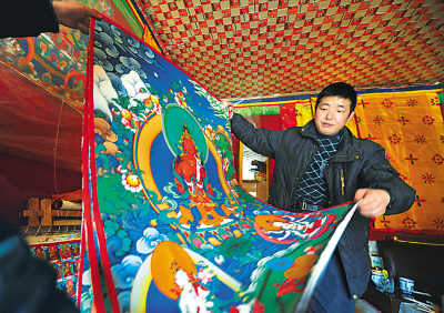 大厅入门处,一只大型的转经筒特别显眼,四壁悬挂着唐卡和藏戏面具,悠扬的藏族歌曲一直萦绕。这是位于北京朝阳区唐人街购物广场内的扎西德勒藏文化用品店,吸引了不少中外来客。店里,产品种类齐全,有佛教用品、藏族家具、服装、饰品、工艺品、图书音像等九大类产品。店里的藏饰,有的是从西藏收购而来的纯手工制品,也有请专业设计师利用天然材料自创的产品。店长拉姆介绍说,现在,从西藏收购而来的手工制品越来越有时代气息,在保留藏饰独特的文化内涵的同时,加入了时尚的设计。