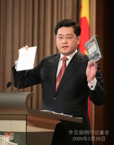三月二十六日,中国外交部发言人秦刚就美发表“中国军力报告”答记者问时表示:美方发表的这份报告严重歪曲事实,干涉中国内政,中方坚决反对,并已向方美提出严正交涉。 中新社发 史利 摄