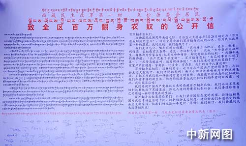 中新网拉萨3月27日电(记者柳俊武)3月28日,西藏各族民众将迎来首个“百万农奴解放纪念日”,西藏自治区也将在拉萨隆重纪念西藏民主改革50周年。27日晚,西藏民主改革第一村——山南地区克松居委会居民,怀着激动的心情,向中新社、中新网寄来了他们致全区百万翻身农奴的一封公开信。全文如下: