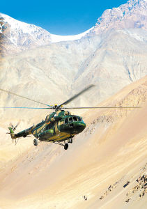 天山山谷,数十架直升机铁翼飞旋,巨大的轰鸣声几乎要把耳膜撕裂。驾驶舱内,机长王厚国在地图上随机标定了此次飞行训练的第一个野外起降点。他说:“过去组织野外起降课目训练前,都要事先勘察选点,在易于起降的场地上插上红旗,再告知精确的经纬度,飞行员据此就可以飞抵起降地点。如今,新大纲打破了这个规矩,既不事先选点也不做任何标记,让飞行员独立搜索选择起降点。”正说着,飞机抵达山谷深处一个陌生地域,巨大的旋翼卷起狂风,吹得积雪四处飞溅。片刻,直升机再次腾空而起,实施第二个训练课目:超低空突袭。