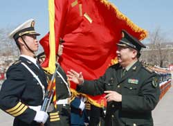 功夫不负有心人。负责阅兵训练的邱巍高将军,放心不下担负军旗手的我,有一次他单独考核我。那天,我撑着4级风刮得猎猎作响的军旗,抬腿带风,落地砸坑,身后跟随将军前来的参谋用钢卷尺测量,每一步都是标准的75厘米,将军满意地笑了。