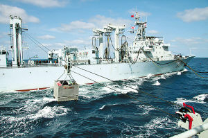 经过9天9夜的航行,今天(注:11日)上午,海军第二批护航编队的“深圳”号导弹驱逐舰和“黄山”号导弹护卫舰,在阿拉伯海与前出接应的第一批护航编队的“微山湖”号综合补给舰会合,并实施了补给。
