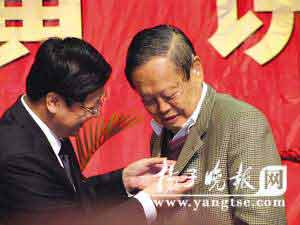 在回答大学生提问时,已届高龄、又患有耳疾的杨振宁,听不清台下学生的提问,、从座位上站起来前倾着身子,似乎还是难以听清,主持人、扬州大学校长郭荣现场当起了“传声筒”,一句一句凑在杨振宁耳边告诉他。耄耋之年的杨振宁思维敏捷,语速很快,听清楚“传声筒”传给自己的声音后,几乎不假思索就侃侃而谈。陈 咏