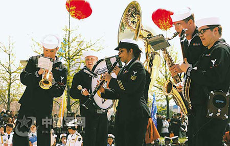 美国海军派出的7人小乐队音色韵味十足,一上场,就掀起一阵热潮。乐手们情不自禁地走到乐池边,近距离为观众演奏了5首乐曲。