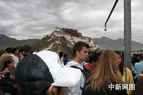 中新网7月22日电 7月22日9时许,500年一遇日全食天文奇观在中国首现西藏,随后沿长江流域东移,中外“追日族”早早涌进西藏各最佳观景点占据有利地势,等待捕捉日食奇观。图为拉萨布达拉宫观景台上的外国游客在等待日食一刻。