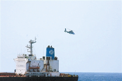 10时15分,“舟山”舰广播里传出命令:“直升机起降部署”。几分钟后,飞行甲板上铁翼飞旋、马达轰鸣,舰载直升机搭载着3名全副武装的特战队员紧急起飞,向“嘉信”号商船疾速飞去,准备驱离“疑似海盗船只”。1分钟后,我方直升机在“嘉信”号上空悬停,3名海军特战队员通过机降和滑降两种方式迅速登船,为受“疑似目标”威胁的商船提供随船护卫。(记者朱达、特约记者余子富)