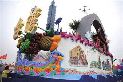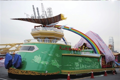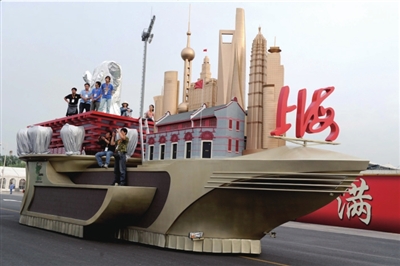 张伟斌说,北京的彩车旨在突出“人文、科技、绿色”三大主题,彩车周围是故宫的围墙,加以红色的飘带和绿色的彩饰,前端是天坛的微型建筑,中间是一个转盘,尾端是鸟巢和水立方的结合。