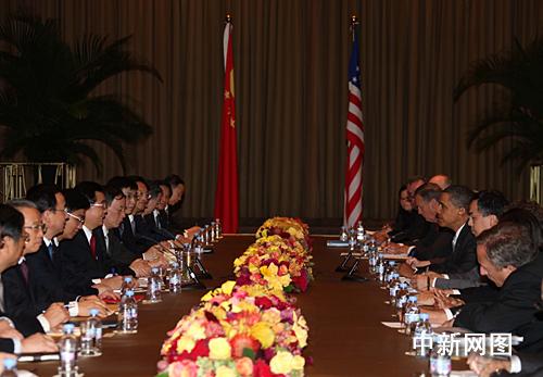 胡锦涛说,我始终认为,一个良好的中美关系不仅符合两国和两国人民的根本利益,而且有利于亚太地区乃至世界的和平、稳定、繁荣。中方愿与美方一道,牢牢把握两国关系的正确方向,深化两国各领域的务实合作,妥善处理两国关系中存在的一些敏感问题,推动两国关系健康稳定地向前发展。