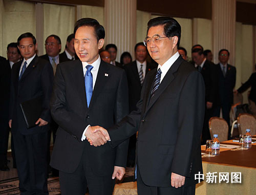胡锦涛说,很高兴与李明博在此见面。借此机会,他愿与李明博就双边关系和共同关心的其他问题交换意见。