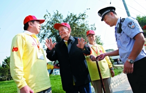 本报讯 (记者刘洋)傅漪泉老人尽管已经104岁高龄,但他仍然坚持穿着黄色志愿者服装,佩戴“红袖标”上街巡逻。
