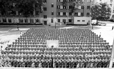 午后,学校中心地带的操场上,阳光直射,同学们在音乐声中,以老师手中上下挥动的彩旗和数字为信号,非常齐整地完成了队列和部分图案练习。据介绍,国庆正式表演时,他们将以旗杆上方的信号灯为指示,在戴耳麦老师以及口令员的共同指令下,完成翻花图案动作变化。