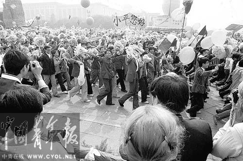 1984年10月1日,参加庆祝中华人民共和国成立35周年群众游行的北京大学学生,突然举起“小平您好”的横幅通过天安门广场。 记者 贺延光摄