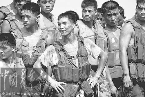 1998年8月9日,奋战在抗洪一线的解放军官兵。两天前,百年不遇的特大洪水致使江西长江主干道决堤30米,40余万九江市民的生命受到严重威胁。 记者 贺延光摄