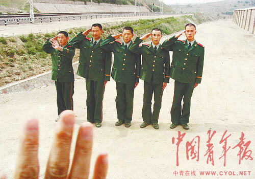 2004年6月2日,甘肃陇西,守卫一座隧道的武警甘肃总队二支队六中队的5名战士向离去的记者敬礼告别。记者 狄多华摄