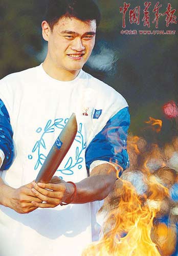 2004年7月9日,姚明在北京颐和园点燃奥运圣火。当天,2004 年雅典奥运会圣火在北京进行传递活动,这是奥运圣火第一次来到中国。 记者 陈剑摄