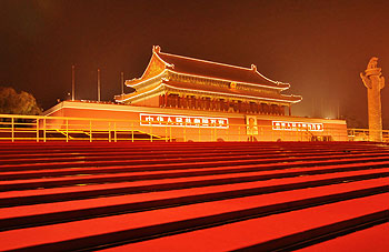 开国大典上临时搭起的两座观礼台是砖木结构的建筑,此后一直沿用,直到1954年6月,为了满足国庆观礼的需要,国家将这两座砖木结构临时观礼台改建成砖混结构的永久性观礼台,使用面积达2470平方米。1959年,又在此基础上衔接成永久性的观礼台。