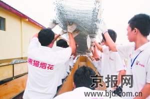 为了保证装车时的平稳,工作人员给每个木箱安装了16个车轮,木箱就变身为“小火车”。3幅网幕焰火巨作,共用了27辆“小火车”,又使用5辆重型货柜车,终于运抵天安门广场。