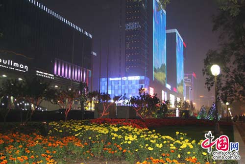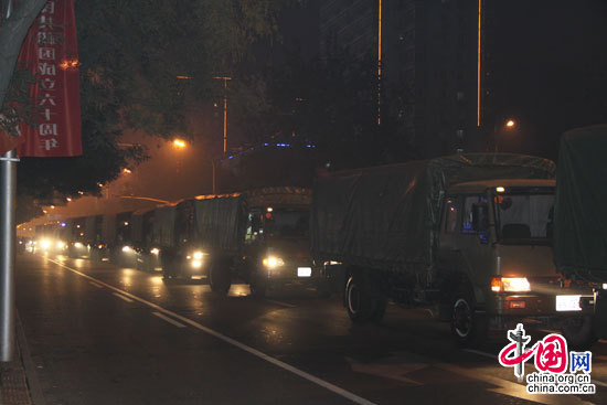 雨后的长安街一片清新,万达购物广场、雕塑公园花坛等照明灯的点缀,让薄雾下的北京格外妖娆。期间,一列车队从西五环方向缓缓驶来,这是为参加今天上午国庆阅兵的武警某部队。虽然是夜间行车,但是车上的小战士情绪很高,一路上有说有笑。(北京时间1时45分 记者冯竹长安街报道)