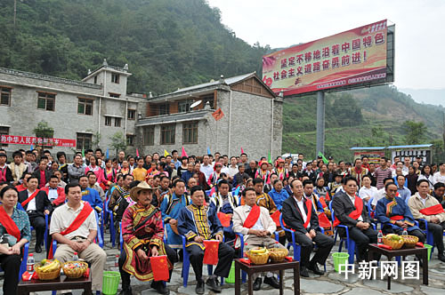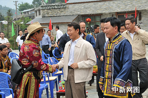 中新网北川10月1日电(曾晓伟)1日,四川省委副书记李崇禧,四川省委常委、省纪委书记欧泽高,绵阳市委书记、市人大常委会主任吴靖平等省市领导专程来到北川羌族自治县曲山镇任家坪村凉风垭卓卓羌寨,亲切看望、慰问当地灾区群众,并与大家一起观看庆祝中华人民共和国成立60周年大会盛况直播。