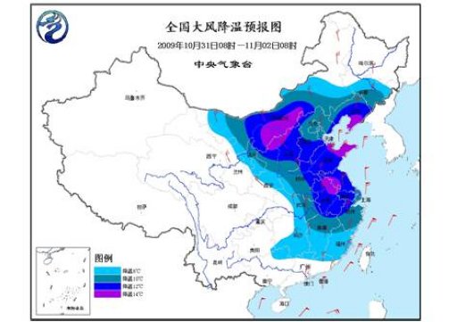 上述地区的气温也将先后下降8~10℃,其中,内蒙古中部、山西北部、河北南部、辽宁大部、山东、江苏、安徽等地的部分地区降温可达12~14℃。
