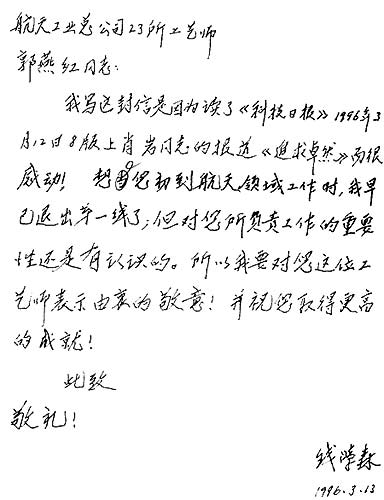 郭燕红迫不及待地打开信。信中用蓝墨水钢笔工工整整写道:“航天工业总公司23所工艺师郭燕红同志:我写这封信是因为读了《科技日报》1996年3月12日8版上肖岩的报道《追求卓然》而很感动!想您初到航天领域工作时,我早已退出第一线了;但对您所负责工作的重要性还是有认识的。所以我要对您这位工艺师表示由衷的敬意!并祝您取得更高的成就!钱学森”。