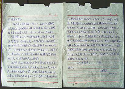 钱学森的这封亲笔信共两页,圆珠笔书写,落款时间是1996年6月30日,收信人是当时的国务委员宋健。收藏此信的文敏女士告诉记者,这封信是自己3年前在北京旧书市场上购买到的,当时一起买到的还有几封名人信札。买回来后,起初也没有很在意,但后来经过阅读,才觉出此信具有非常高的价值,便一直珍藏至今。从信中内容得知,钱老不光研究航天科学,对水的问题也很关心,并提出了很好的建议,而这方面以前很少有人提。现在,钱学森的去世让所有中国人都感到惋惜和悲痛,这时把这封信公布出来,算是自己对老人表达的一份崇高敬意吧。