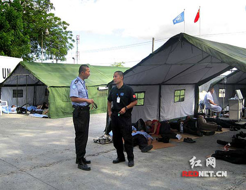 接下了的工作是紧张繁忙的,签到,培训,分配工作。每天我们都得很早就起床,穿戴整齐,把手枪,警棍,瓦斯和急救包都佩戴好,把皮鞋刷亮,这些工作我们谁都不敢马虎。因为根据联合国的规定我们每个人的衣服上除了佩戴联合国的标志外,还必须得佩戴本国的国旗。这也就意味着你走在任何一个地方,世界各地的维和警察,军事观察员,民事官员和海地的民众都会知道你是一个来自中国的警察,你的一言一行都会和中国两个字联系在一起。再看看其他国家的维和警察,他们也同样有着很强烈的荣誉感,从他们锃亮的皮鞋,鲜艳的带着熨过痕迹的制服以及整齐佩戴的装备,你都可以很明显的感觉得到这一点。