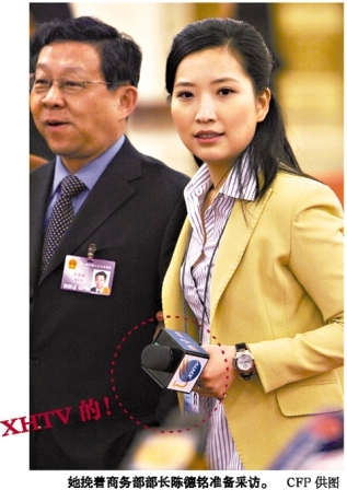 这名高调出镜的美女到底是谁?有人猜她是新闻发布会召集人,但从她手中标有“XHTV”的话筒来看,她很可能是新华社旗下新华网络电视的记者。