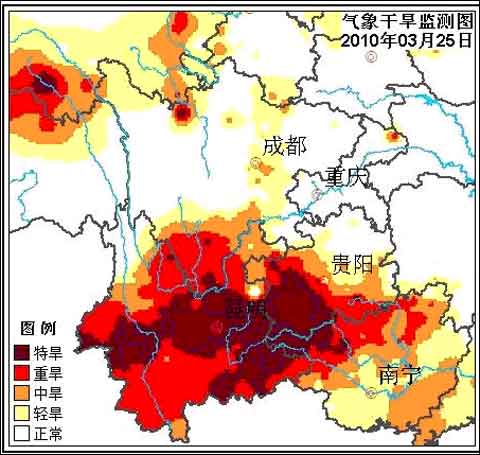 3月25日气象干旱监测显示,云南、贵州西部和南部、广西西部和北部、川西高原南部等地存在中度以上气象干旱;其中云南大部、贵州西南部、广西西北部、川西高原南部等地存在重度以上气象干旱。