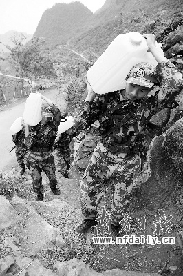 告别岩门屯许大妈家时,已是中午1时多,官兵们顾不上吃午饭,拎着空桶又急匆匆向山下走去,他们要在就近的山涧采集清泉,为给下一个村的老百姓送水争取时间……(南方日报特派记者洪奕宜 通讯员李三红 发自广西百色)
