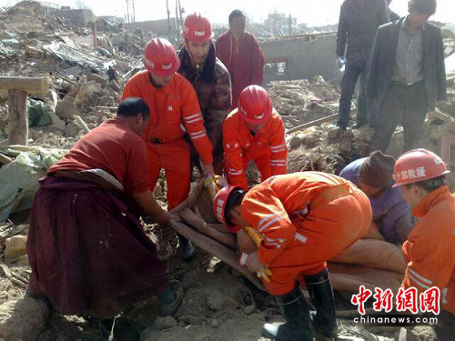 15日凌晨0:40分,什邡救援队接到玉树州抗震救灾指挥部命令,前往玉树州玉树县结古镇结古寺参与救援。什邡救援队队员们不辞辛劳,在废墟中发现一名中年妇女,尚有气息,队员们立即展开救援,经过约40分钟的紧张施救,顺利地将其救出,经简单的救治后,立即送往医疗队救治。