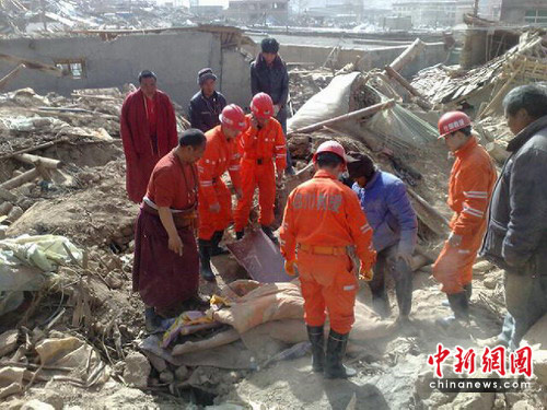 救援队到达后玉树县后,首先赶到结古镇“玉树州综合民族职业学校”垮塌现场,并立即展开搜救。据了解,该职业中学的三层电教楼全部垮塌,下面还有10余名学生被埋。什邡市安全生产应急救援大队抢险队员运用专业工具马上进行施救。经过一夜紧张救援,被埋压在职业学校电教大楼下的6名学生遗体被挖出,搜救仍在继续。