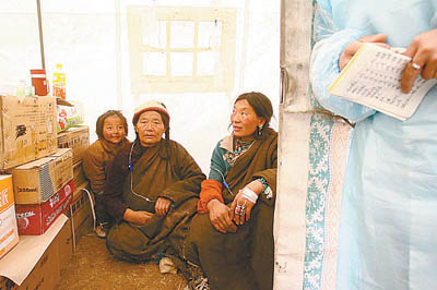 看一看玉树街头的人们,你会五味杂陈。伤感无处不在:小学生的校服和红领巾上沾着灰,好像是刚从倒塌的校舍里抛出来的一样;9岁的孩子抱着烂了一半的梨子不肯撒手;革及着拖鞋的外地女人失神地站在消失了的货栈面前。但也有些时候,能遇上刚领了一把挂面的女孩笑呵呵地露出白色牙齿,或是孩子在蓬头垢面的母亲怀里安睡。一个孤独的老妇人牵着一条狗,面色平静地坐在倒掉的院墙边上,让人不禁想起“家园”和“守候”这些词汇。