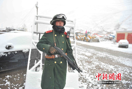 中新网玉树4月22日电(记者 贾国荣)今日清晨,青海省玉树地震灾区一夜风雪后,抗震救灾现场一片洁白,天寒地冻,救援倍加艰难。