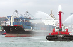 两岸海运15日全面直航。台湾基隆港务局在码头举行首航仪式,并派出引水船为首批解缆出航的直航货轮洒水祝福。(来源:台湾《中国时报》)