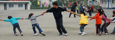 进这所学校在去年的地震中,四层教学楼整体坍塌,473名学生中死了226名,47名老师死了22名。现在,这些从废墟中被幸运掏出来的孩子们,又重新活跃在临时建成的学校操场上。他们跳着,跑着,笑着,嚷着,像一群叽叽喳喳的小鸟。
