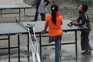 在学校操场边的乒乓球桌旁,我见到了左腿截肢的6年级学生李雯茜。雯茜只有11岁,扎一个长长的马尾辫,脖子上系着红领巾,穿桔红色上衣,笑起来满脸都是阳光。