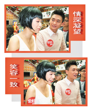 活动中一会男方深情凝望女方,一会两人又露出一致笑容。